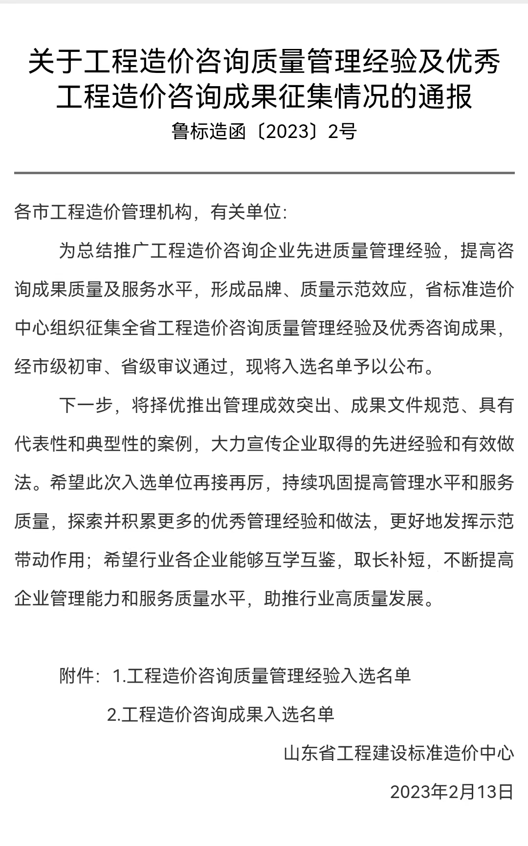 ?為總結(jié)推廣工程造價(jià)咨詢企業(yè)先進(jìn)質(zhì)量管理經(jīng)驗(yàn),提高咨詢成果質(zhì)量及服務(wù)水平,形成品牌、質(zhì)量示范效應(yīng),省標(biāo)準(zhǔn)造價(jià)中心組織征集全省工程造價(jià)咨詢質(zhì)量管理經(jīng)驗(yàn)及優(yōu)秀咨詢成果,經(jīng)市級(jí)初審、省級(jí)審議通過,我公司入選山東省工程建設(shè)標(biāo)準(zhǔn)造價(jià)中心“工程造價(jià)咨詢成果”名單。